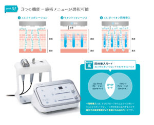 当院は、エレクトロポレーション+イオントフォレーシスを同時導入できるモードを備えた サンソリッド社独自の最新型医療機関専売機器である「electroporation PLUS+」を導入しています。