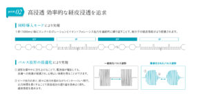 エレクロポレーションは、イオン導入と比べ20倍の美容成分浸透力が得られますが、同時交互導入によりさらに2.1倍の美容成分浸透力が得られます。