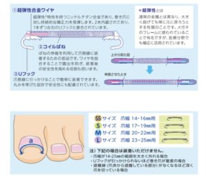 巻き爪マイスターは、コイルばねに内蔵された超弾性合金ワイヤーの弾性力によって装着している間に巻き爪が徐々に矯正される医療機器です。